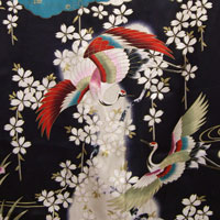 This Japanese kimono is made from 100% silk. Colorful cranes and white cherry blossoms are set against a shimmering black background.